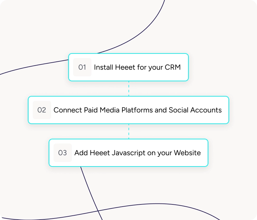 Implementing Heeet is quick and straightforward. The process varies slightly depending on your CRM, but the core steps remain the same: install or connect Heeet, link your paid platforms, configure your attribution model, and add the Heeet Javascript to your website