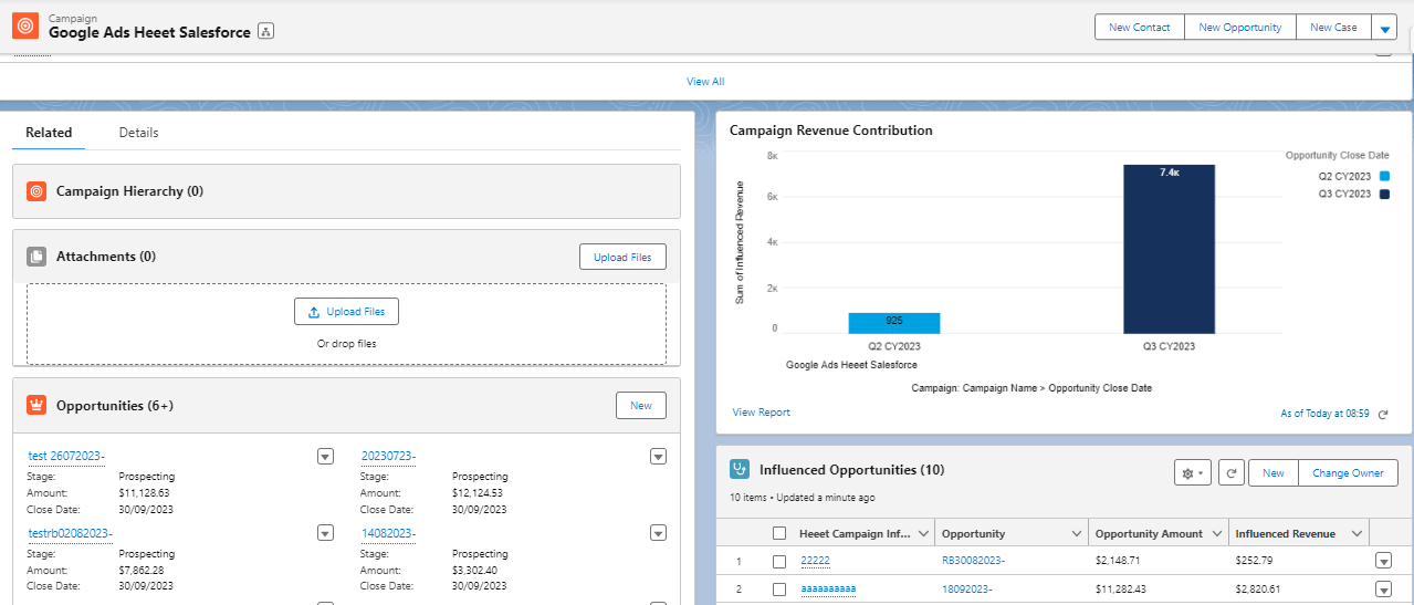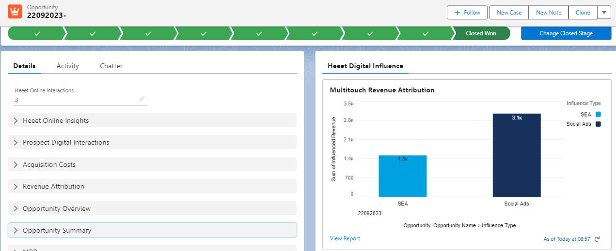 Advanced channels and campaigns influence enables marketers to identify exactly how many Salesforce leads and how much Salesforce opportunities revenue have been generated per specific digital channels (SEO, Social Organic, SEA, Social Ads,...) and campaigns (Google Ads campaign A, Linkedin campaign B,...)