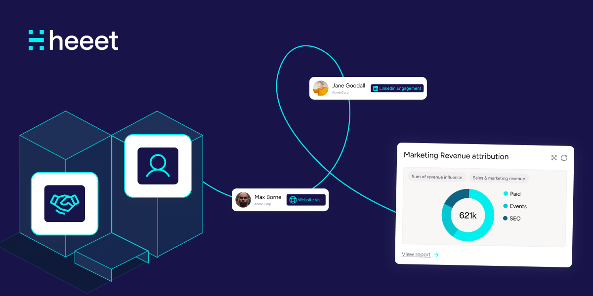 Most teams run into a problem here: Salesforce’s built-in Campaign Influence reports are limited. To connect Campaign Influence with Opportunity fields, Account data, and Contact engagement, you need custom report types or a tool that brings this data together. Heeet does this in Salesforce, linking event-campaign membership to revenue attribution across the buyer journey, so your team doesn’t have to build pivot tables in Google Sheets.