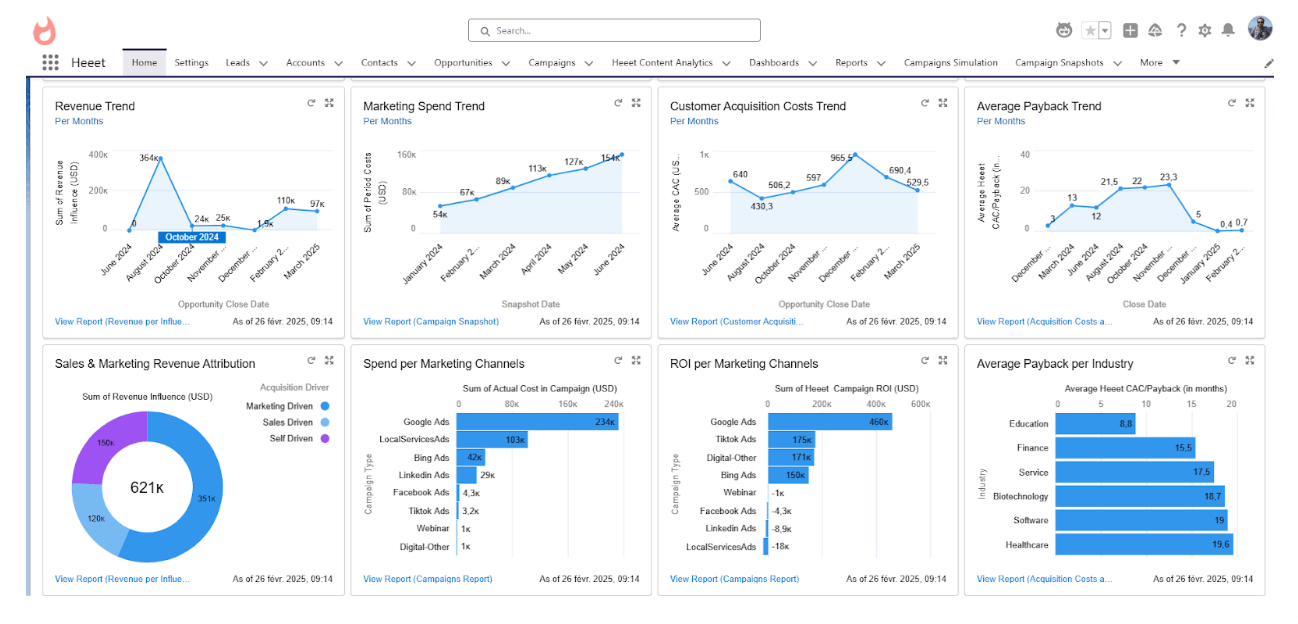 With Heeet, you'll gain a comprehensive understanding of how each channel contributes to revenue, cost per lead (CPL), customer acquisition cost (CAC), campaign ROI, and the number of interactions required to convert a lead, plus dozens of other advanced marketing insights.